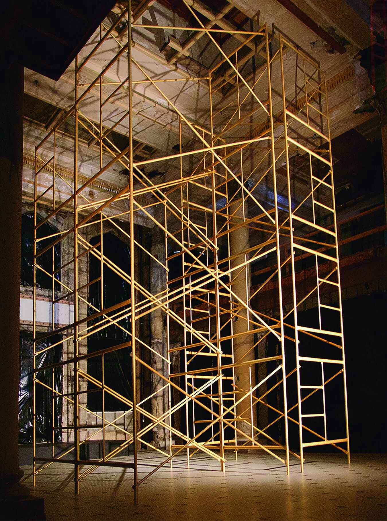 In Mineral Spirits, the decayed and darkened lobby of the Astor Hotel is the location of an assemblage of non-functional scaffolds and recorded sounds. The scaffolds, painted in a soft metallic gold, hint at the hotel’s glorious past. Stage lighting and residual natural sunlight interact to produce subtly changing shadows of the scaffold on the floor and the ceiling. Stretches of silence are interrupted with modified field recordings of the construction of the scaffold, invoking the spirits of guests past and present.