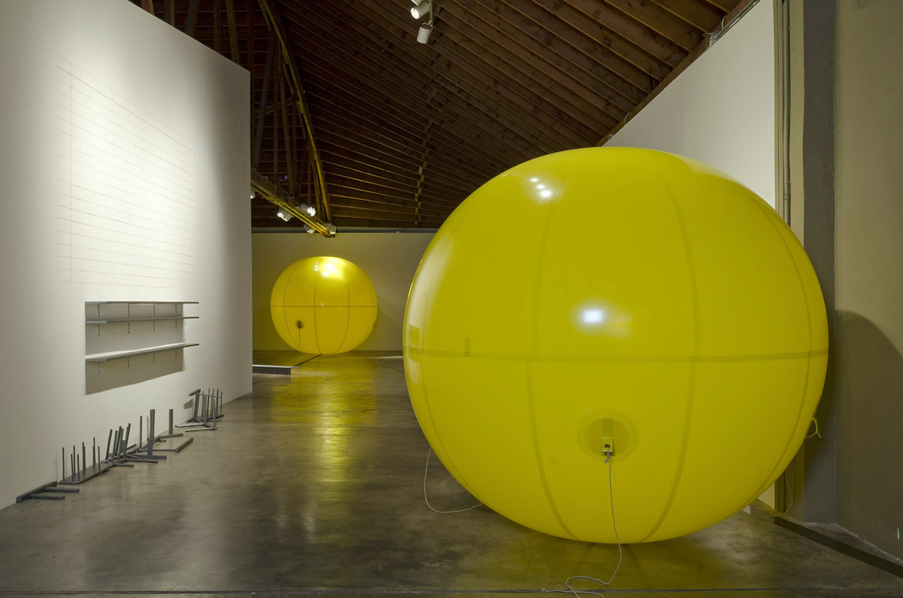 Score enacts a perfect yet playful distortion of experience through an engagement with the physicality and location of the space, reanimating a familiar game and history. This resultant work is heightened through the use of color and materials that complement and comment on the architecture of the gallery, the gentrification of the Kenton neighborhood, and the geographic landscape of the North West.